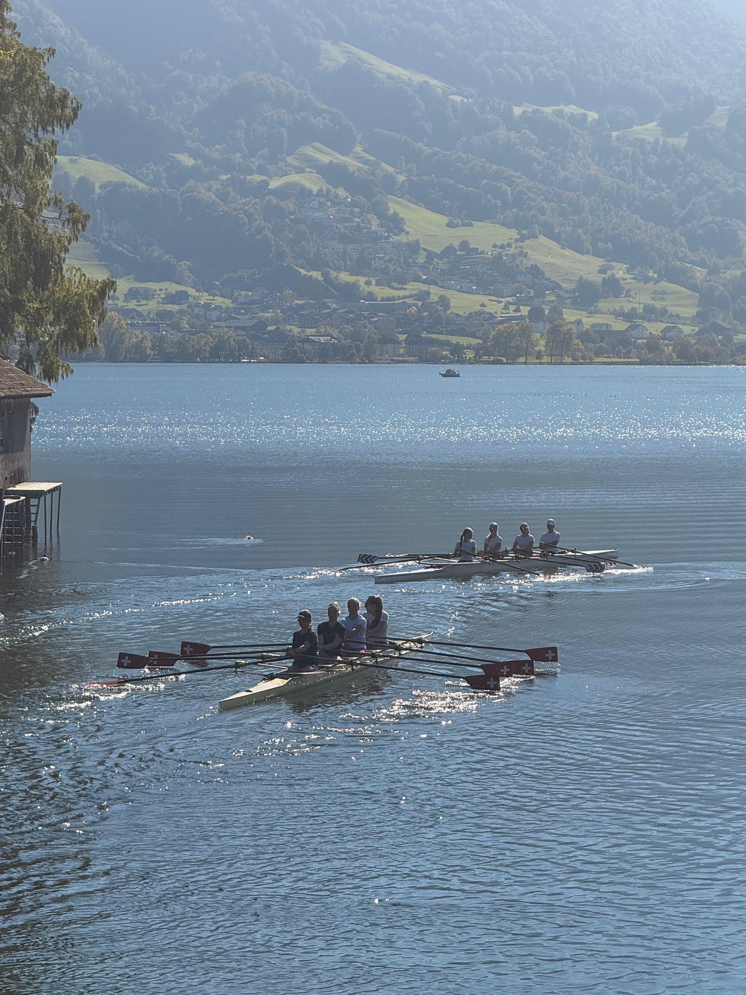 Während der Woche trainierten wir nicht nur im Skiff, sondern auch in Doppelvierern und sogar im Riemenachter! Neben den Wassereinheiten standen auch mehrere Kraftraumtrainings auf dem Programm, bei denen wir vor allem an unserer Übungstechnik arbeiteten. Eine besondere Abwechslung bildete die Recovery-Einheit – dort sind wir alle eingeschlafen, so entspannend war sie und so müde waren wir von den vielen Eindrücken. Am Mittwochabend fand eine Antidoping-Schulung statt. Wir erfuhren, worauf wir künftig achten müssen, wenn wir Medikamente einnehmen, und wo wir uns bei Unsicherheiten informieren können. Es war sehr lehrreich und wichtig für unsere sportliche Zukunft. Der krönende Abschluss der (viel zu kurzen) Woche war am Freitag die Sarnen Royal Regatta und anschliessend mehrere Teamspiele. Die Regatta wurde im 1:1-Sprintformat ausgetragen: Wer gewann, kam eine Runde weiter. Wir schafften es beide bis ins Viertelfinale. Am Nachmittag standen dann Teamchallenges auf dem Programm: Zuerst ein Ergometer-Wettkampf, bei dem wir im Siebner-Team sechs Kilometer so schnell wie möglich rudern mussten. Es war unglaublich anstrengend, aber dank der lauten Anfeuerungsrufe aller auch richtig cool! Danach folgte Tug of War (Seilziehen) und schliesslich das Spiel „The Floor is Lava“, bei dem wir als Team eine Strecke nur über Gewichtsscheiben überwinden durften. Unsere Gruppen gehörten zu den schnellsten! Annas Team gewann sogar das Gesamtspiel! Als Preis gab es eine grosse Toblerone, die wir selbstverständlich brüderlich und schwesterlich geteilt haben.